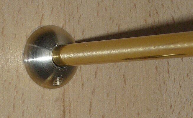 Rosette: Aus Messing gefertigt mit Gewindeschaft D=12 mm zur Befestigung mittels beigefügter Mutter. Aufnahmeschaft für das Halteröhrchen mit Außendurchmesser 13 mm und Minimadenschraube zur Fixierung des eingesteckten Halteröhrchens. Sichtbare Länge nach Einbau 65 mm.